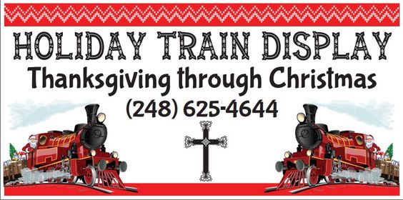 A holiday train display with a holiday market or either Santa or Mrs. Claus available most days.